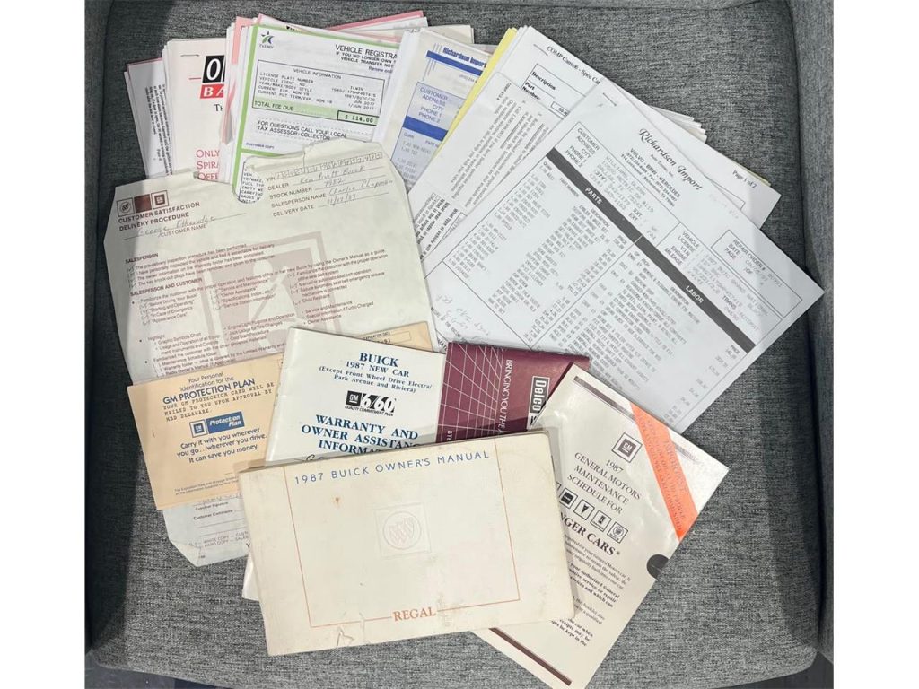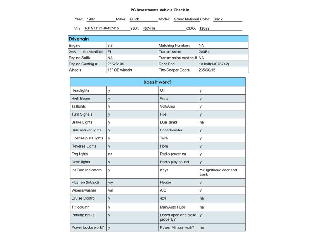 1987 Buick Grand National. VIN:1G4GJ1175HP457415. Built 3.8 liter Turbocharged V6 engine. 200R4 Automatic transmission with overdrive. Aftermarket headers and stainless exhaust. Power steering, Power disc brakes, Factory air-conditioning. Bucket seats / Center console. Power windows / Power locks / Tilt steering column. 12K Actual miles.