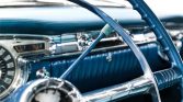 INTERIOR: I love the blue against the black. The interior is in very nice shape has mild staining in places. The dash area is magnificent. It has the optional padded dash and it fits perfectly. The abundance of chrome, knobs, lenses and gauges are in beautiful shape. The metal trim is repainted smooth and glossy. The steering wheel is real nice. The seats have been recushioned and completely reupholstered. Seat belts were added front and back. The door panels are replaced. Real nice cloth headliner, no holes. The domelight works.