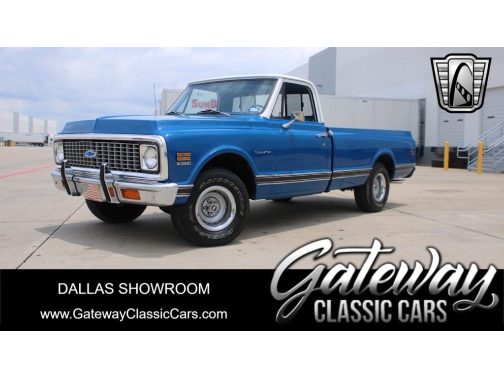 Gateway Classic Cars of Dallas is proud to offer this sharp 1972 Chevrolet C10 Pickup Truck. The current owner obtained this long bed pickup out of Texas and has enjoyed it since. Walking around this C10 one should notice the gloss two toned blue with white paint theme. Adding to the curb appeal are chrome bumpers, spray in bedliner, toolbox, chrome mirrors, chrome/black trim, chrome handles, white Chevrolet painted on the tailgate, dual exhaust with chrome tips, and…
